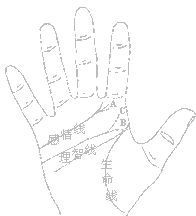 图C.(含图B),三线同源,即是感情线(图C)末端有一支线(图B)下垂伸入理智线,也是感情线在干扰理智线,但情况较只有图B轻微,少了一份糊涂心,却多了一份无谓的牺牲精神。爱情虽美,却带有一些无奈。此特征的人,称为“感情牺牲型”。这种人婚前如果失恋过,在婚后反而较安定。
